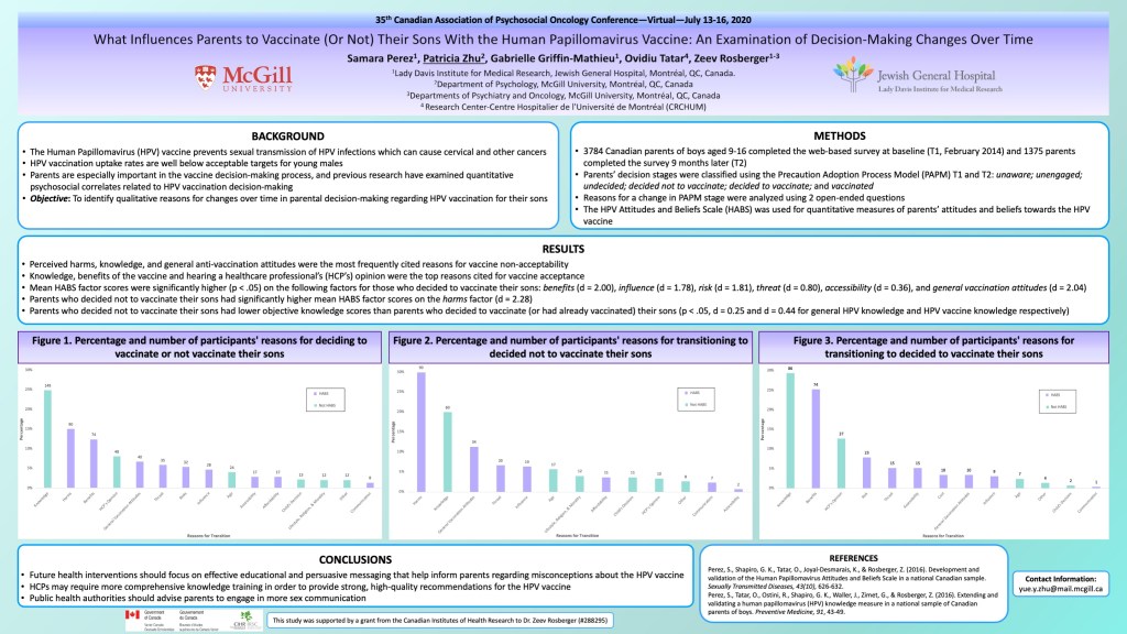 Perez, S., Zhu, P., Griffin-Mathieu, G., Tatar, O., Rosberger, Z. (2020). What influences parents to vaccinate (or not) their sons with the human papillomavirus vaccine: an examination of decision-making changes over time. [Poster] 35th Canadian Association of Psychosocial Oncology Conference – Virtual – July 13-16, 2020, St-John’s, NL, Canada. Funding Sources: Canadian Institutes of Health Research (CIHR) – 288295.