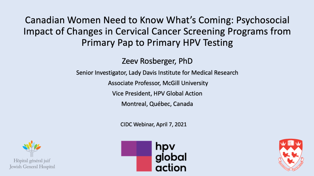 Rosberger, Z. (2021) Canadian Women Need to Know What’s Coming: Psychosocial Impact of Changes in Cervical Cancer Screening Programs from Primary Pap to Primary HPV Testing. [Webinar] Consortium for Infectious Disease Control (CIDC)