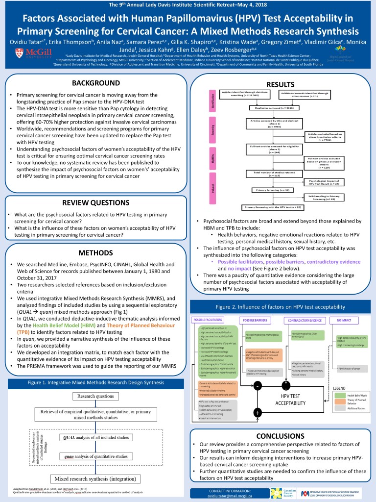Tatar, O., Thompson, E., Naz, A., Perez, S., Shapiro, G.K., Wade, K., Zimet, G., Gilca, V, Janda, M, Kahn, J, Rosberger, Z. (2021) Factors Associated With Human Papillomavirus test Acceptability in Primary Screening for Cervical Cancer: A Mixed Methods Research Synthesis [Poster] 9th Annual Lady Davis Institute Scientific Retreat – May 4, 2018