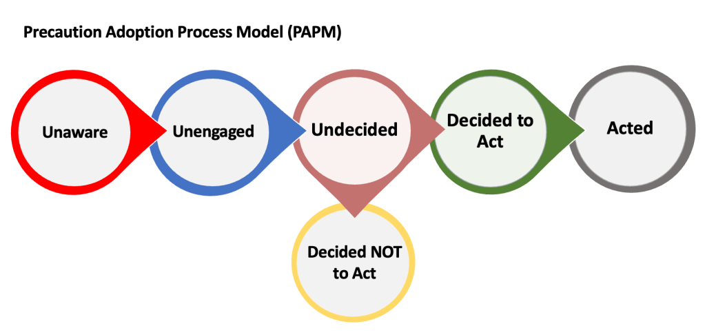 Our primary framework to understand decision-making is the Precaution Adoption Process Model (PAPM), a stage-based model which considers the process of deciding to, or not to engage in a behaviour. Using this model, we have gained insight into how different groups approach health decision-making. For example, in a longitudinal study, we found that parents who reported that they had “decided not” to vaccinate their children against HPV were more “rigid” and less likely to move towards “decided to” than those who were initially “undecided” (Tatar, et al., 2019).
